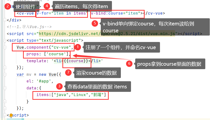v-bind:course=“item”:将遍历的item项绑定到组件中props定义名为course属性上;= 号左边的course为props定义的属性名,右边的为item in items 中遍历的item项的值。