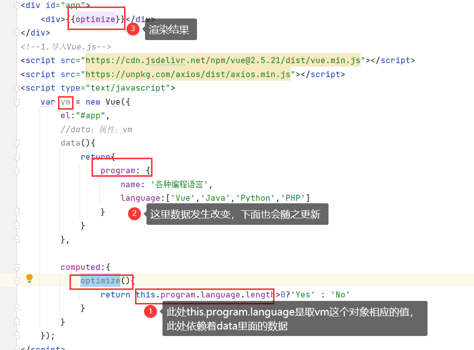 我在这里定义了optimize计算属性,里面的this.program绑定了data()里面的数据,是依赖着data(),当数据发生改变optimize里面的内容也会重新计算相应更新。