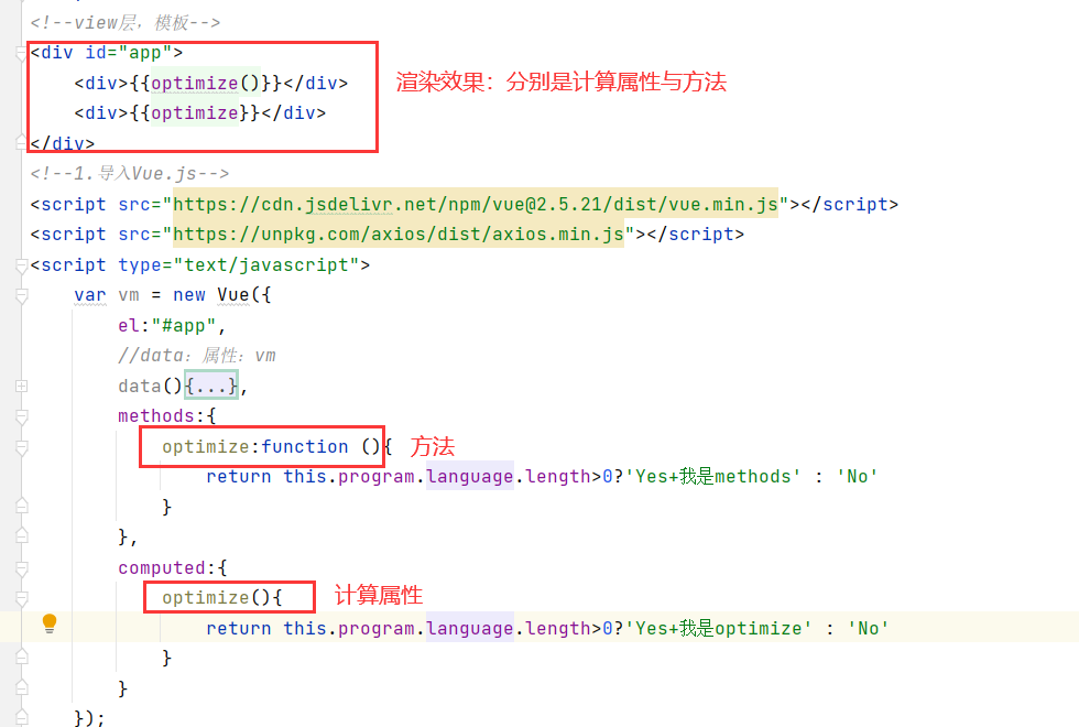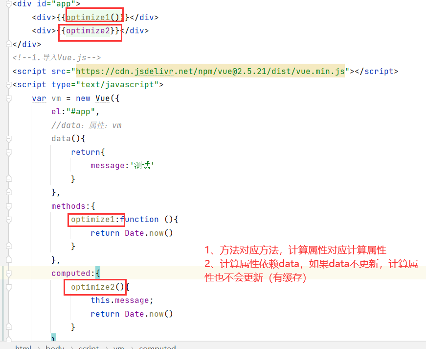 computed:定义计算属性, 调用属性使用optimize2, 不需要带括号:this.message是为了能够让optimize2观察到数据变化而变化