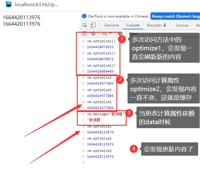如何在方法中的值发生了变化,则缓存就会刷新!可以在控制台使用vm.message=”新消息”, 改变下数据的值,再次测试观察效果!